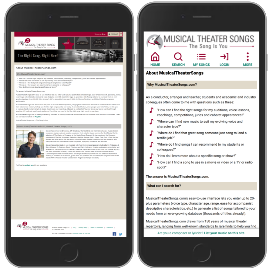 The original application had two functional parts (actually three if you count the Mongodb database as a part of the application) but was built as a single app (except for the database which is a separate service). The two functional parts are the website front-end, the part end users see and use for their searches and store their songs lists. The other part is an admin section where new songs, shows, composers and lyricists are entered and modified. It also manages user’s subscriptions, both individual and institutional (universities, etc). [...more]