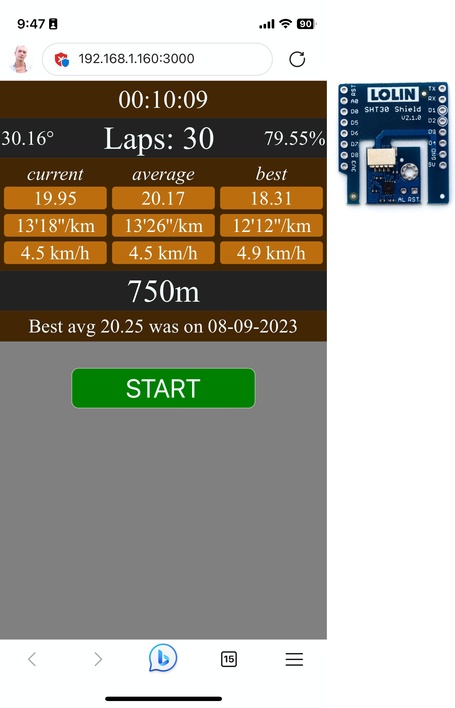 As you can see in the image left and right of the laps counter, the temperature was over 30 degrees Celsius and the humidity was almost 80% (I live in South East Asia). The temperature and specially the humidity differs from day to day and between early mornings and afternoons. So adding this information to the app and to the AWS Dynamo database is a good way to analyze how big of an influence this has on my performance.