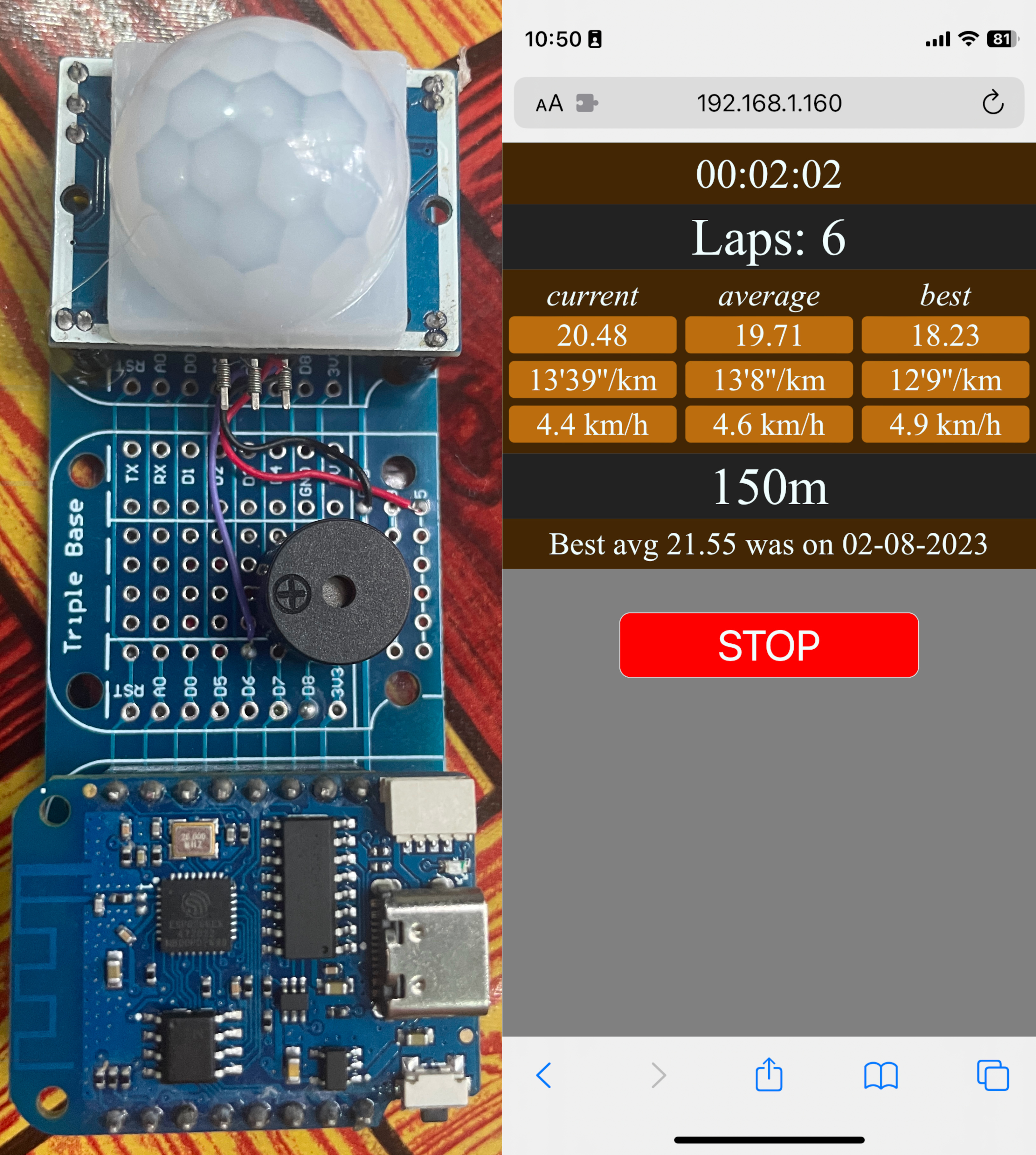 This works wonderfully well. The first time I pass the motion sensor it will start the timer and every next pass it will add a lap time and send that to the node js app. I can start and stop with the web app on my phone.