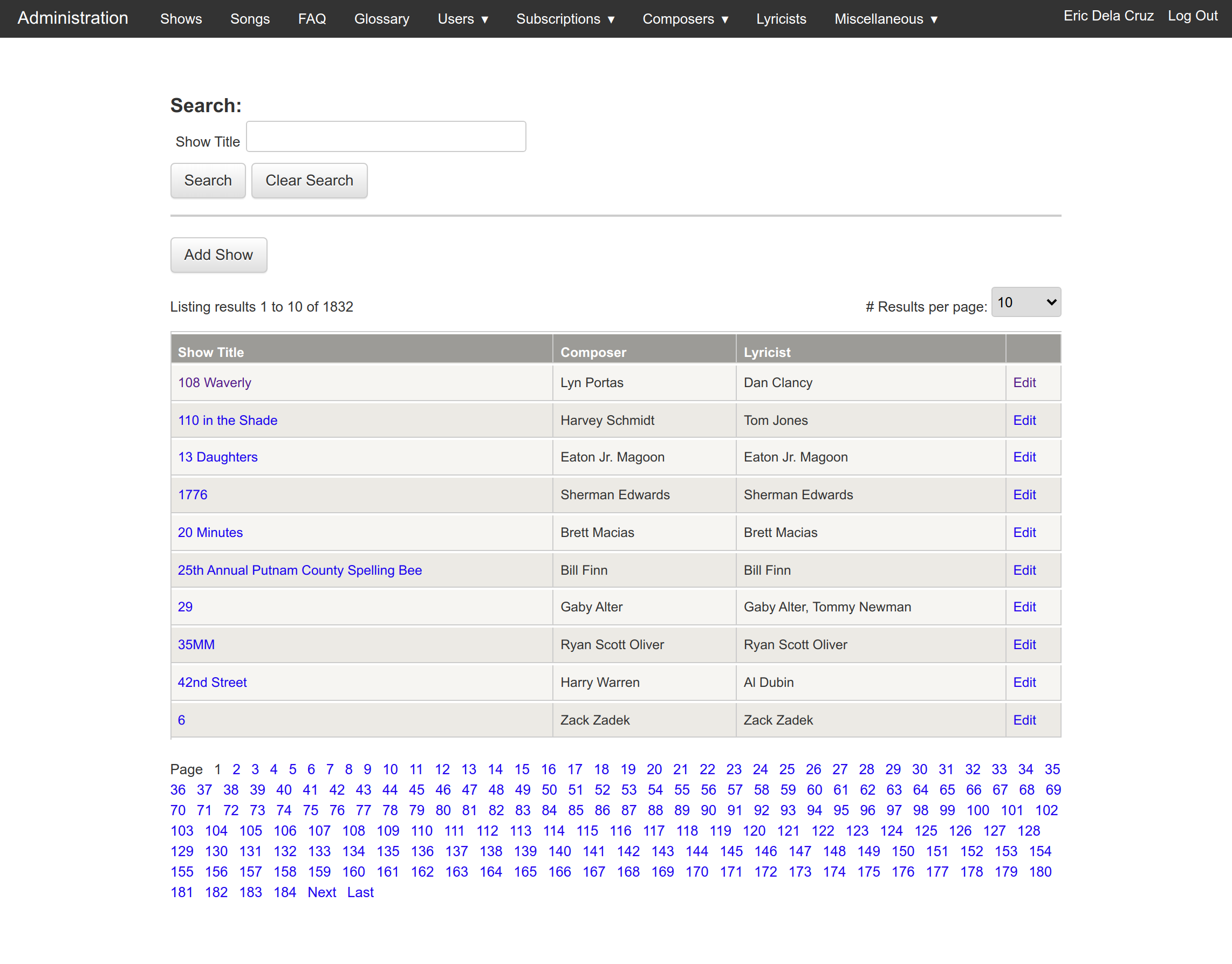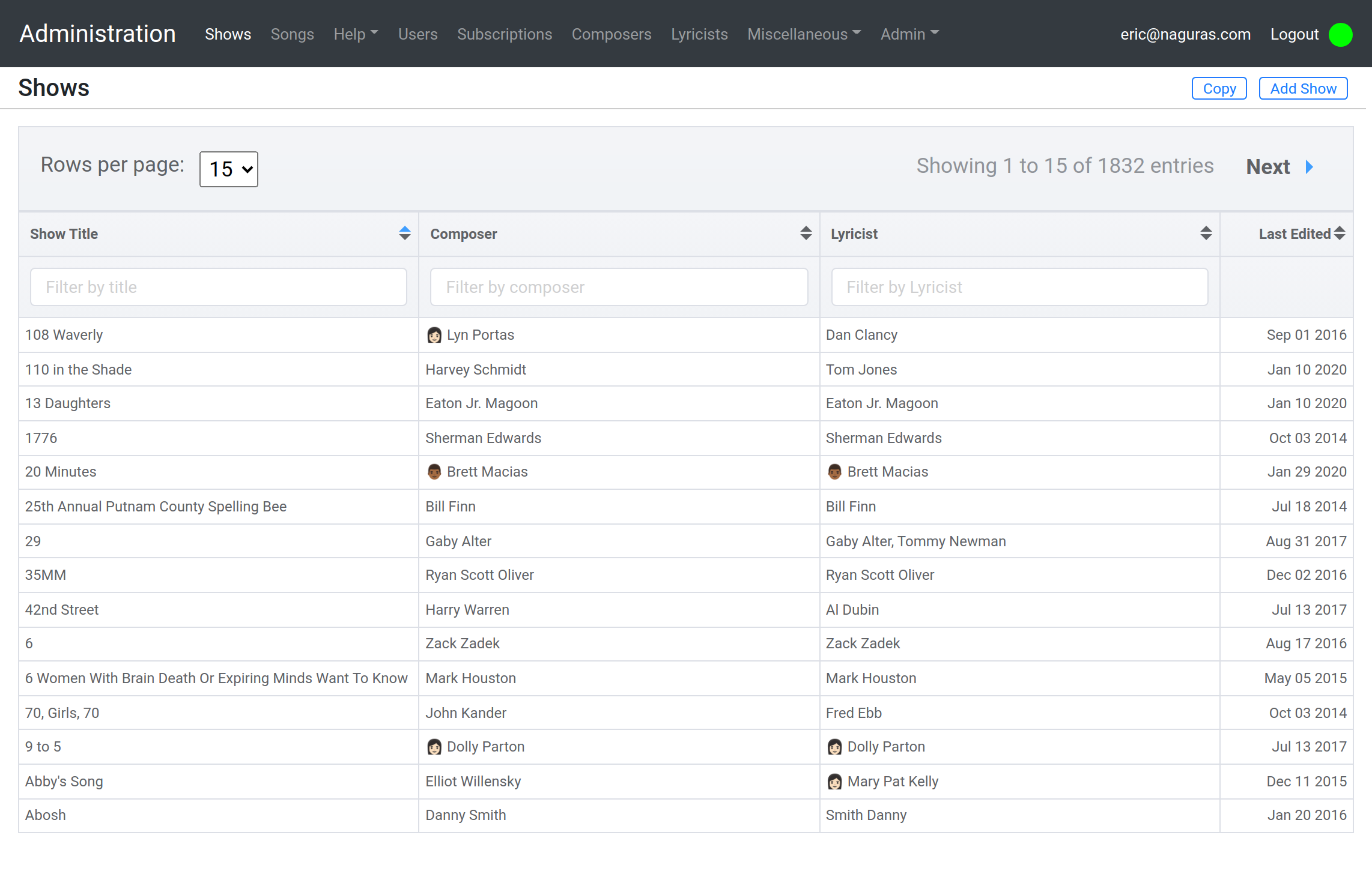 section where new songs, shows, composers and lyricists are entered and modified. It also